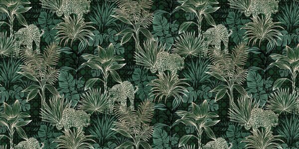 Een patroon van een sluipende panter in de jungle. Hip en trendy behang voor in de kinderkamer.