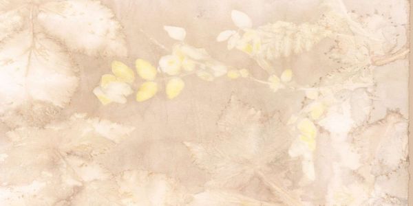 Behang in warme tinten met frisgeel en witte details in de bladeren