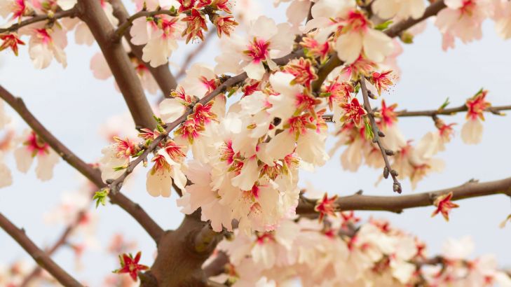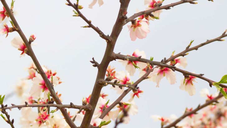 Close-up foto van een bloesem tak met helderblauwe lucht