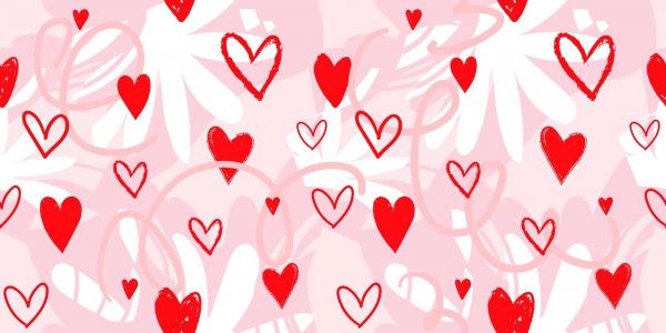 Een vrolijk patroon vol rode en roze harten, speelse lijnen en zachte bloemachtige vormen op een roze achtergrond. De levendige kleuren en luchtige stijl creëren een romantische en opgewekte sfeer.