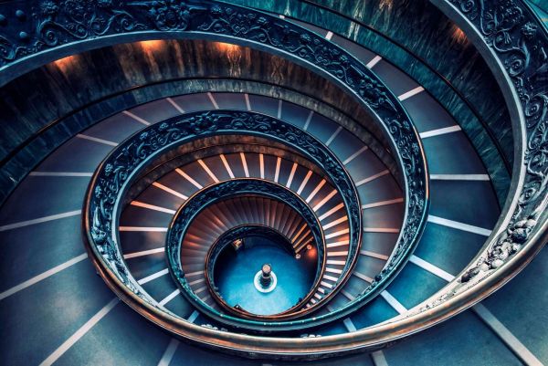 Dit fascinerende ontwerp dompelt de ruimte onder in een visuele draaikolk van elegantie en symmetrie. De spiraalvorm, geïnspireerd op een monumentale wenteltrap, trekt onmiddellijk de aandacht en geeft een sterk gevoel van beweging en diepte. Het kleurgebruik is bijzonder harmonieus: koele tinten zoals nachtblauw en staalgrijs worden verwarmd door accenten van koper en zacht amberlicht, wat het geheel een sfeervolle, bijna filmische uitstraling geeft.