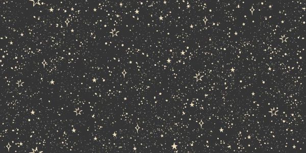 Een levendig sterrenpatroon met glinsterende vormen, spatten en stipjes in zacht crème op een diepe zwarte achtergrond. Het ontwerp straalt magie, lichtheid en een vleugje fantasie uit.