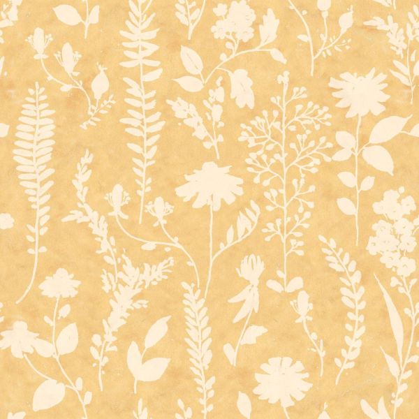 Dit warme en uitnodigende ontwerp laat een speels patroon van botanische silhouetten zien, met bloemen, bladeren en takjes in een zachte crèmetint. De achtergrond is een rijke honinggele kleur met een subtiel verweerde textuur, waardoor het geheel een warme, zonnige uitstraling krijgt. De combinatie van kleur en vorm zorgt voor een luchtige, natuurlijke sfeer die tegelijkertijd vrolijk en verfijnd aanvoelt.
