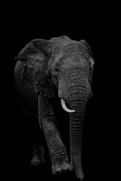 De zwart-wit weergave legt de nadruk op vorm en aanwezigheid. Het beeld voelt klassiek en sterk.