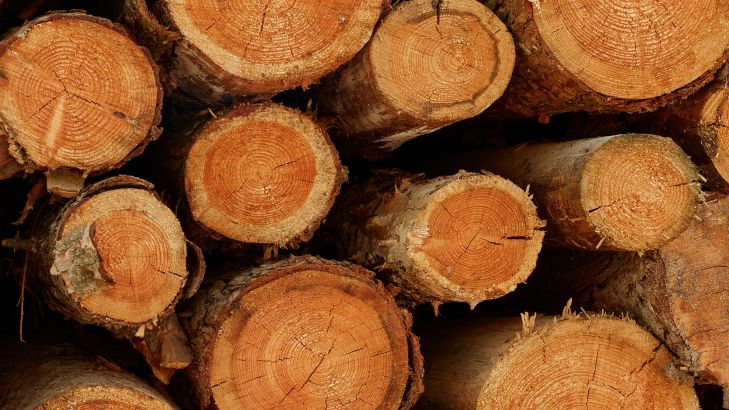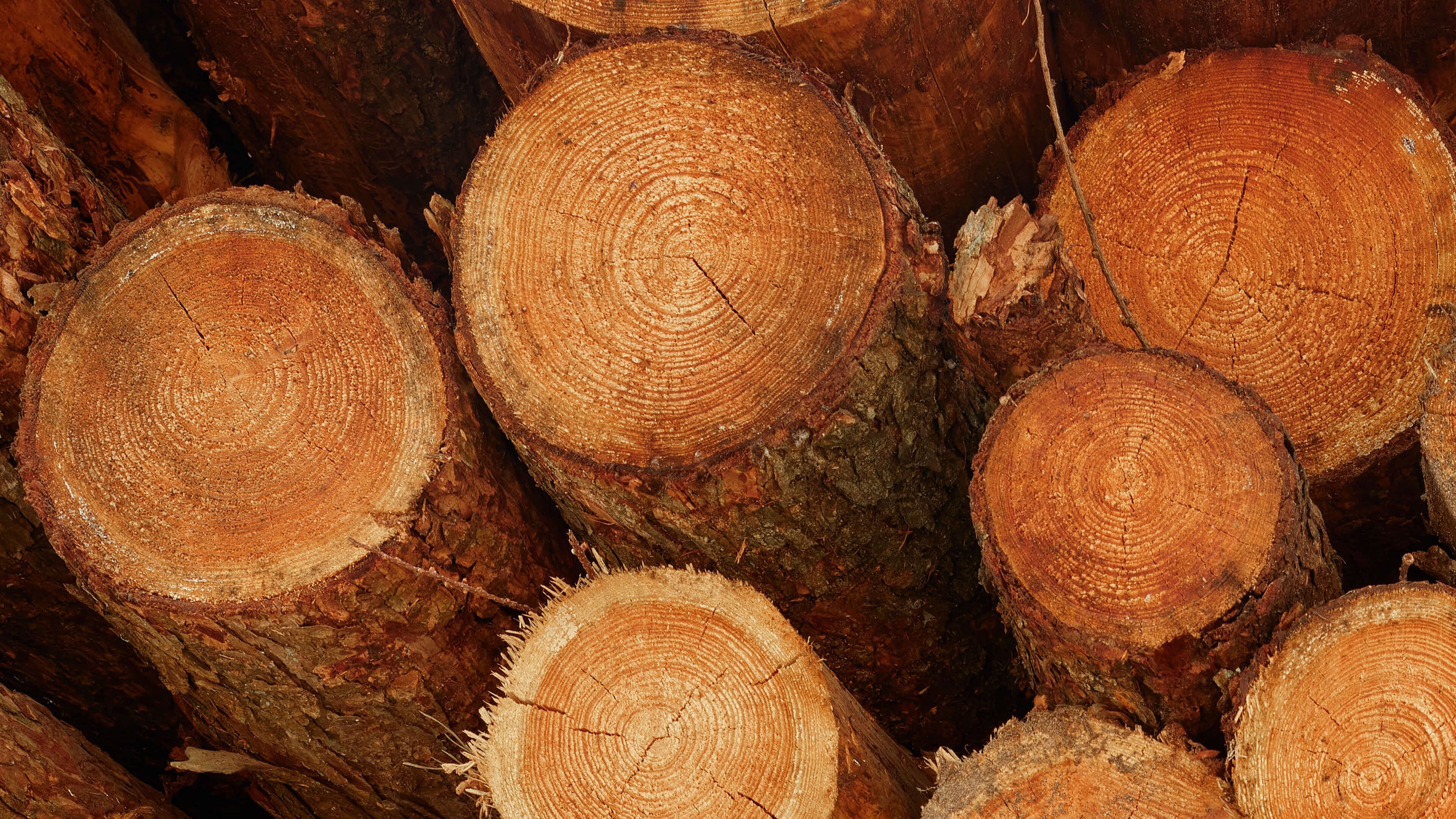 Mooie stapel van donkere boomstammen in het Speulderbos