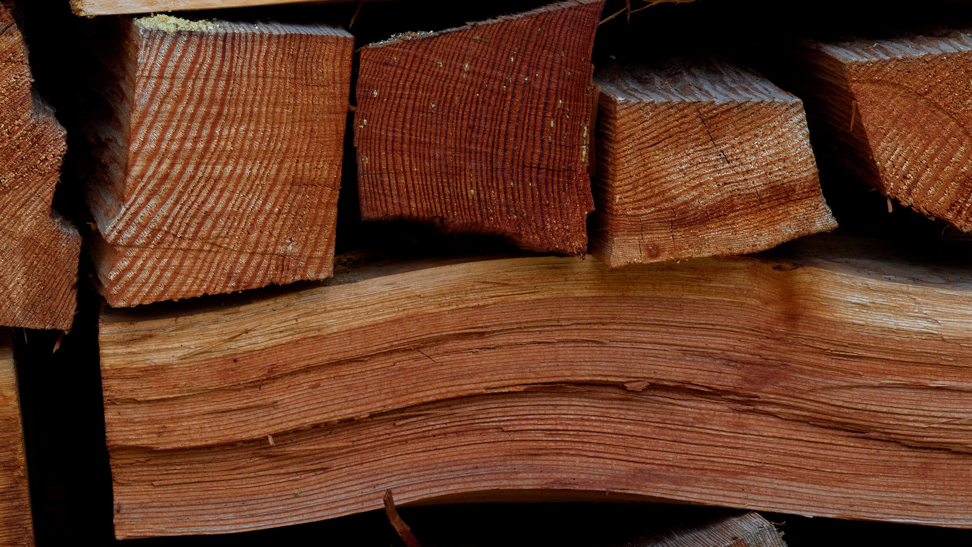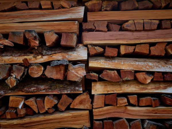 Op verschillende manieren gestapelde houtblokken. Combineer dit fotobehang in jouw woning en creëer een warme fijne sfeer in huis.