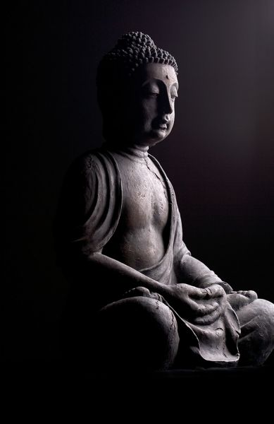 Een stenen Buddha met een donkere achtergrond.