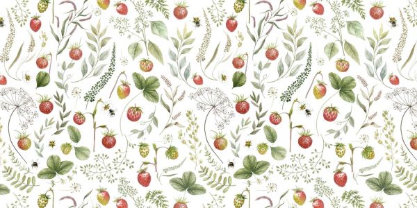 Een levendig patroon met rijpe aardbeien, bladeren en bloesems, vergezeld door speelse bijen, op een witte achtergrond. De gedetailleerde illustraties en frisse kleuren brengen een zomerse en natuurlijke uitstraling, ideaal voor het toevoegen van een vrolijk en speels accent aan elke ruimte.