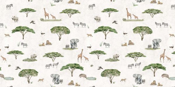 Een zonnig savannepatroon met wilde dieren zoals giraffen, olifanten, leeuwen en zebra’s, verspreid tussen acaciabomen en open grasvlakten. De achtergrond en gedetailleerde illustraties roepen de warmte en weidsheid van de Afrikaanse savanne op, ideaal voor een avontuurlijke en natuurlijke uitstraling in elke ruimte.
