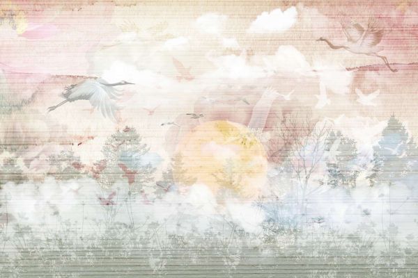Een etherisch ontwerp waarin vogels zweven boven een mistig landschap bij zonsopkomst. De zachte pastelkleuren en subtiele details creëren een dromerige en rustgevende sfeer, perfect voor een serene uitstraling.