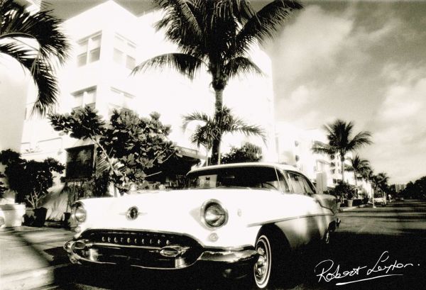 De iconische vormen van de auto, met haar glanzende chroomdetails en vloeiende lijnen, worden versterkt door de omliggende tropische setting. De palmbomen en de vintage gebouwen op de achtergrond brengen een vleugje Miami-chique, waardoor het ontwerp zowel elegant als warm aanvoelt.