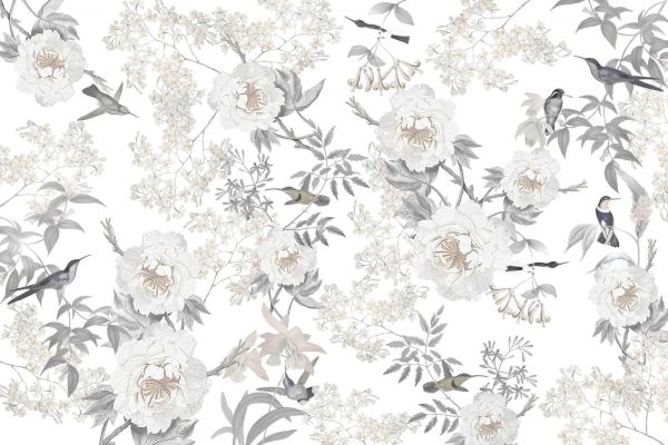 Een verfijnde compositie van natuurlijke schoonheid, waarin bloemen, vogels en botanische elementen in een harmonieuze balans zijn weergegeven. Subtiele kleuren en gedetailleerde patronen zorgen voor een elegante en tijdloze uitstraling die iedere ruimte transformeert.