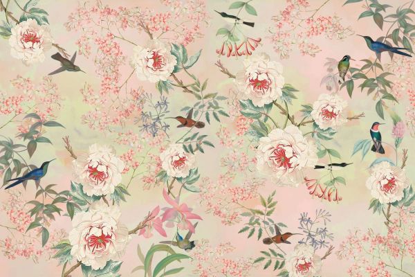 Een verfijnde compositie van natuurlijke schoonheid, waarin bloemen, vogels en botanische elementen in een harmonieuze balans zijn weergegeven. Subtiele kleuren en gedetailleerde patronen zorgen voor een elegante en tijdloze uitstraling die iedere ruimte transformeert.