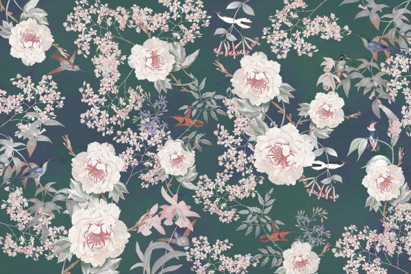 Een verfijnde compositie van natuurlijke schoonheid, waarin bloemen, vogels en botanische elementen in een harmonieuze balans zijn weergegeven. Subtiele kleuren en gedetailleerde patronen zorgen voor een elegante en tijdloze uitstraling die iedere ruimte transformeert.