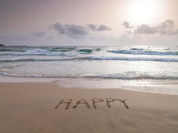 Tekst in het zand op een rustig strand. In het zand staat ''Happy'' geschreven.
