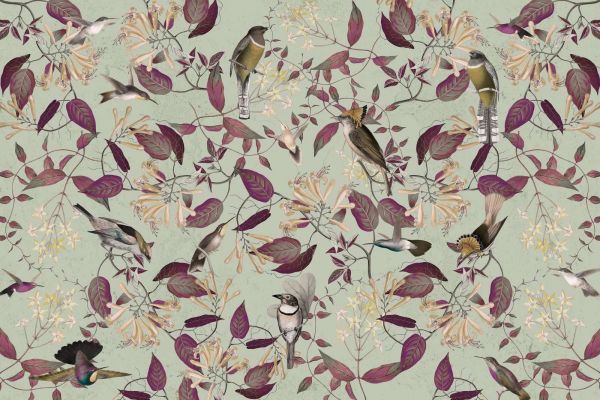 Een speels en elegant ontwerp met kleurrijke vogels te midden van ranke bladeren en delicate bloemen, perfect om een ruimte te vullen met een vleugje natuurlijke harmonie en verfijning.