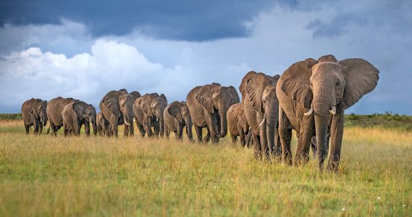 Fotobehang van The Land Of The Giants. Een rij olfianten die door een grasveld heen lopen.
