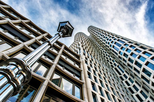 Een foto in kikvorsperspectief van een artistiek gebouw die in golvende lijnen is ontworpen.