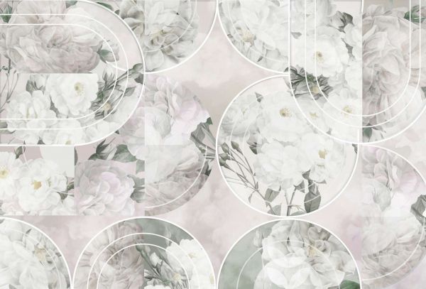 Dit ontwerp combineert de romantische schoonheid van grote rozen met een modern geometrisch kader. De delicate roze en witte tinten van de bloemen worden perfect aangevuld door een subtiele achtergrond van groene en beige nuances. Deze combinatie zorgt voor een rustgevende sfeer die zowel verfijning als warmte uitstraalt.