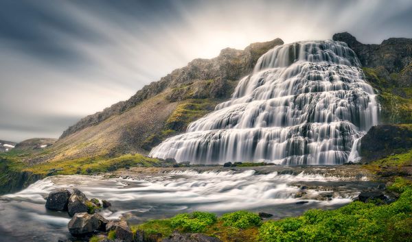 Timeless fotobehang. Een grote waterval loopt over in een rivier met op de achtergrond zonnestralen.