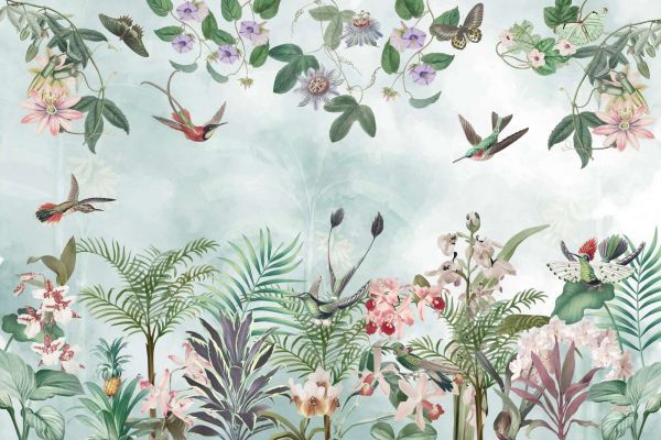 Een levendig tropisch tafereel met kleurrijke bloemen, weelderige bladeren en exotische vogels zoals kolibries. Vlinders fladderen subtiel tussen de passievruchtbloemen, waardoor een sfeer van rust en avontuur ontstaat. De zachte aquarelachtergrond voegt diepte toe, terwijl de gedetailleerde flora en fauna het ontwerp verfijnd en elegant maken.