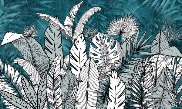 Getekende tropische bladeren op een betonnen achtergrond in petrol kleur.