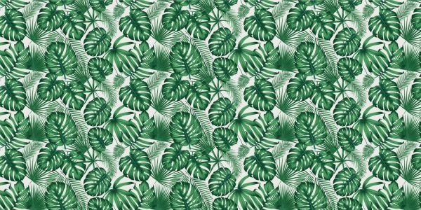 Groen behang met verschillende soorten tropische bladeren erop.