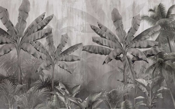 Een sfeervol en ingetogen tropisch tafereel met grote bananenbladeren en palmbomen in zachte grijstonen. De subtiele nevel en het verweerde effect geven een dromerige en rustgevende uitstraling. Dit ontwerp vangt de serene schoonheid van een tropische ochtend, waarin de natuur langzaam ontwaakt in de mist.