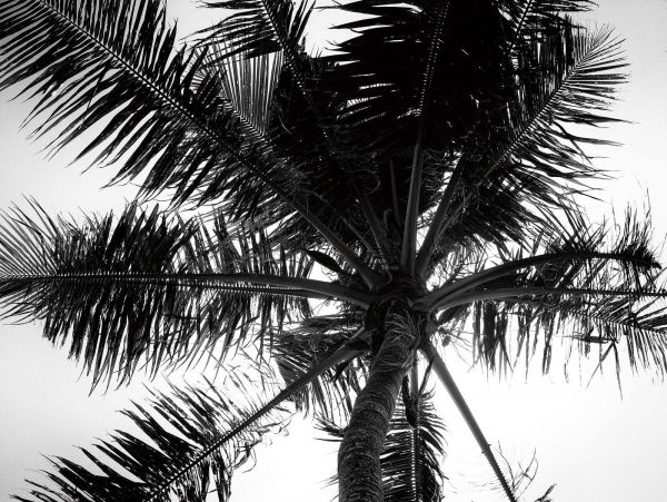 Deze zwart-wit compositie toont een indrukwekkend perspectief van een palmboom, van onderaf gezien, met dramatisch uitwaaierende bladeren. Door het ontbreken van kleur ontstaat een krachtig grafisch spel tussen licht en schaduw, waarbij de bladeren scherp afsteken tegen de heldere lucht. De texturen van de stam en bladeren zijn gedetailleerd zichtbaar, wat het geheel een bijna fotografisch realisme geeft met een minimalistisch karakter.