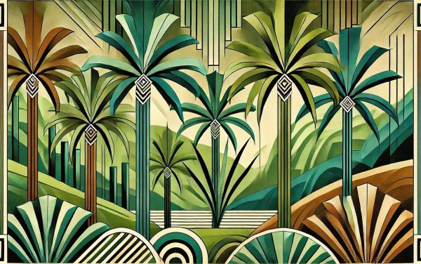 Gestileerde palmbomen rijzen op in een ritmisch landschap vol geometrie, groene tinten en grafische patronen. Het ontwerp combineert tropische weelde met de strakke elegantie van art deco.