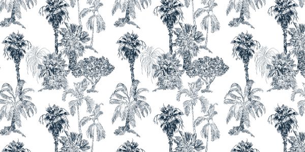 Fotobehang van tropische palmen en bomen. Creëer meer sfeer in de woonkamer met dit behang.