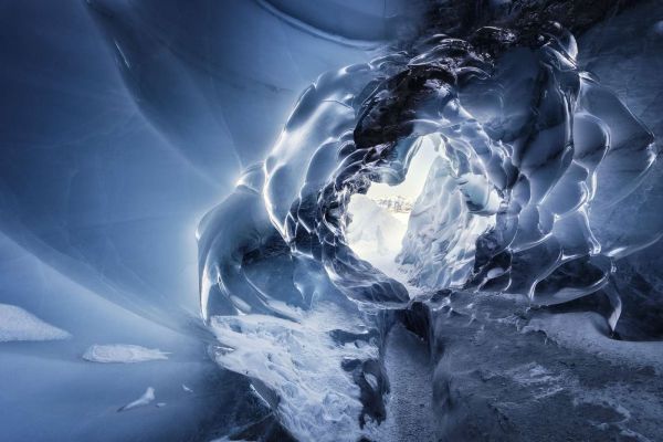 De winter in Alaska biedt spectaculaire plekken zoals deze gletsjerspleet diep in de Matanuska gletsjer.
