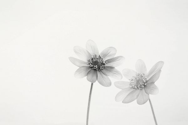 Twee kleine bloemen naast elkaar in het zwart-wit.