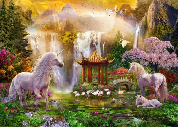 Een fantasierijk landschap met sierlijke eenhoorns, serene watervallen en een kleurrijke lotusbloemvijver. Een traditionele tempel, omringd door bloeiende bomen en een regenboog die de lucht siert, maakt het tafereel compleet met een magische uitstraling.