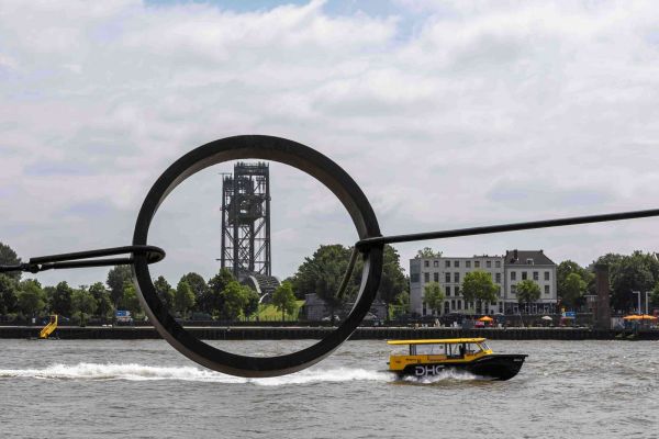 Een speels en dynamisch stadsbeeld waarin de iconische Hefbrug perfect wordt omlijst door een cirkelvormig metalen element. Op de voorgrond vaart een opvallende gele waterbus over de Maas, wat beweging en energie toevoegt aan de compositie. De heldere lucht en het groen aan de overkant zorgen voor een frisse en evenwichtige uitstraling.