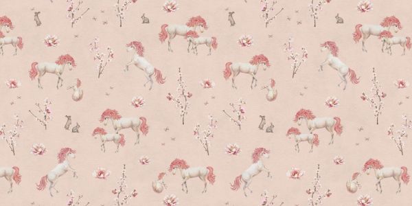 Een betoverend patroon met sierlijke eenhoorns, bloesemtakken en zachte bloemen. De romantische roze tinten en delicate illustraties creëren een magische, dromerige sfeer, perfect voor het toevoegen van een fantasierijk accent aan elke ruimte.