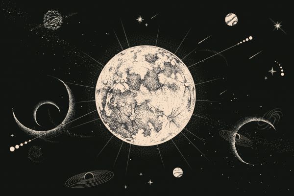 Een mooie illustratie van de maan met verschillende Universum elementen op de achtergrond.