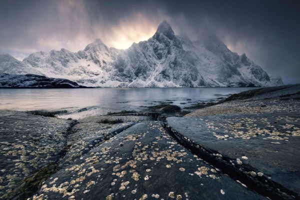 De winterse Lofoten-eilanden zijn een droombestemming voor elke natuurliefhebber. Talloze fjorden, zoals deze, doorkruisen de archipel en zijn prachtige bergen.