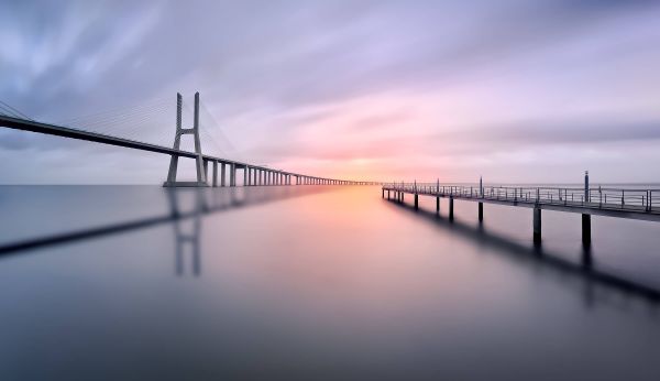Vasco de Gama brug op fotobehang. De Vasco da Gamabrug is een ruim 12 kilometer lange tuibrug over de Taag ten oosten van Lissabon.