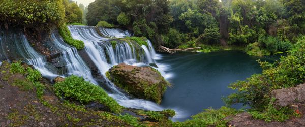 Waterval verborgen in de tropische jungle omgeven door een natuurlijk zwembad met helder water.
