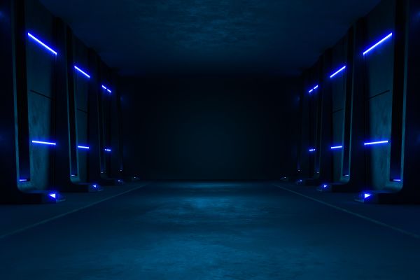 Een verlaten gang met led verlichting. Met dit fotobehang in de kamer is het net alsof je in deze verlaten kamer staat.