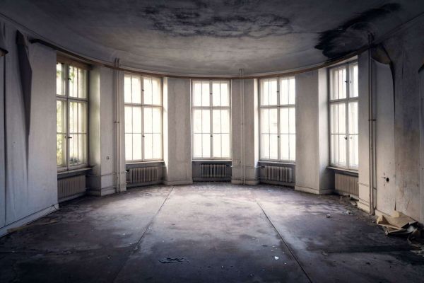 Dit ontwerp straalt een gevoel van verlatenheid en nostalgie uit, met een grote ronde kamer waar de tijd stil lijkt te staan. De hoge ramen laten zacht daglicht naar binnen stromen, waardoor de contouren van de ruimte op een subtiele manier worden geaccentueerd. De versleten vloer, scheuren in de muren en het donkere spoor van vocht op het plafond geven het beeld een mysterieuze en melancholische uitstraling.