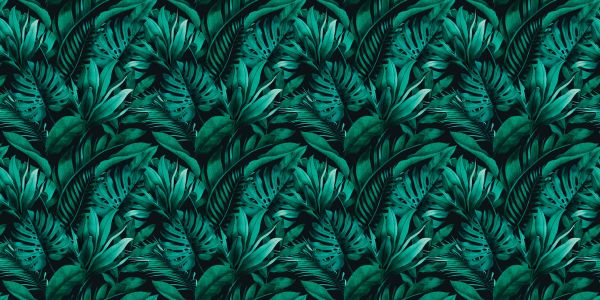 Tropisch patroon met exotische monstera, banaan en palmbladeren op donkere achtergrond.