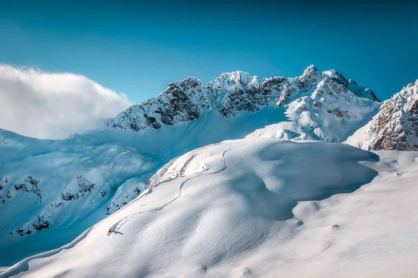 Een bijna meditatief beeld van rust en grootsheid: een stille witte helling met slechts één spoor dat zich sierlijk een weg baant door de verse sneeuw. De ruige bergen op de achtergrond staan in scherp contrast met de zachte, golvende sneeuwstructuren op de voorgrond. De diepe blauwe lucht benadrukt de hoogte en helderheid van dit winterlandschap, terwijl het zachte zonlicht subtiele schaduwen werpt die de vormen versterken.