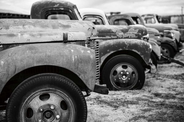 Een rij oude, roestige pick-up trucks staat stil in de tijd. De zwart-witstijl benadrukt de textuur van metaal, slijtage en historie, met een nostalgische, bijna filmische sfeer.