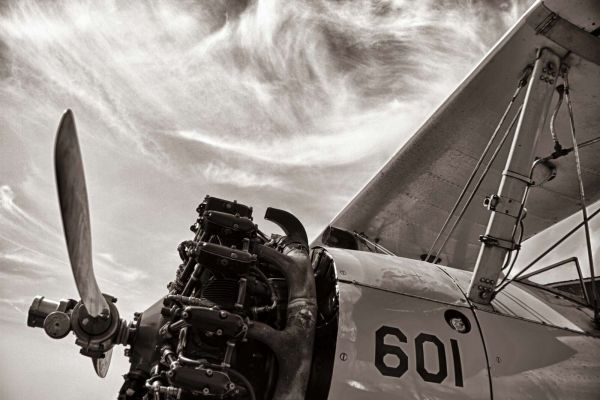 Dit beeld brengt op indrukwekkende wijze de charme van de luchtvaartgeschiedenis tot leven. Een klassiek propellervliegtuig, weergegeven in contrastrijk zwart-wit, toont zijn robuuste mechaniek tot in het kleinste detail. De krachtige lijnen van de motor, bouten en kabels vormen een industrieel spel van vormen en texturen. Op de achtergrond bewegen sierlijke wolkenpatronen over de lucht, wat zorgt voor een spannend contrast tussen vastheid en luchtigheid.