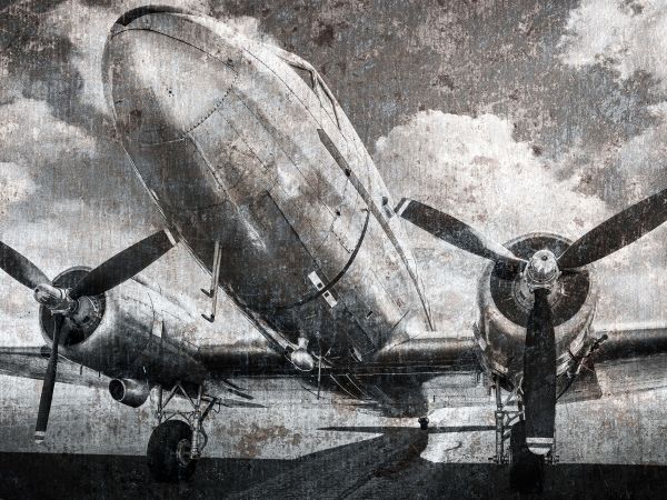 Vintage vliegtuig op beton. Dit behang heeft door het beton een vintage effect.
