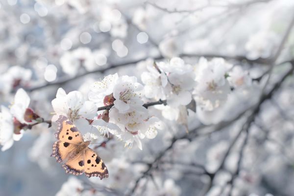 Vlinder bij witte bloesems