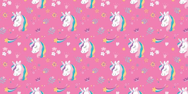 Een vriendelijke unicorn met roze, paarse, blauwe en gele manen. Om de unicorn heen zitten bloemen.