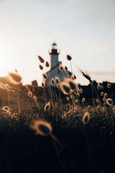 Een vuurtoren doemt zacht op in de achtergrond, terwijl pluizig duingras baadt in warm avondlicht. Het beeld straalt rust, nostalgie en zomerlicht uit in een verstild moment.